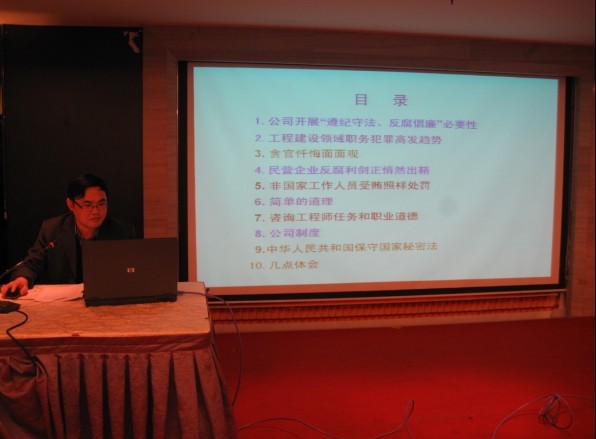 2011年11月19日,公司在新城商務(wù)酒店會議室召開《“遵紀(jì)守法、反腐倡廉”職業(yè)道德教育大會》,公司全體員工參與會議,會議由孫立新副總經(jīng)理主持,王核副總工程師主講。大會針對目前工程建設(shè)行業(yè)出現(xiàn)的違法違紀(jì)問題進(jìn)行了剖析和舉例,對我們工程建設(shè)咨詢單位人員的職業(yè)道德提出了各方面的要求。大會結(jié)束后還分小組進(jìn)行了討論,全體員工積極踴躍發(fā)言談了自身的感想和體會,通過這次教育大會的召開,每位員工都受到了既沉重又深刻的教育,促使大家在今后的工作中要從思想上、行動上嚴(yán)于律己,努力成為一名遵紀(jì)守法,恪守職業(yè)道德的優(yōu)秀工程咨詢?nèi)藛T。