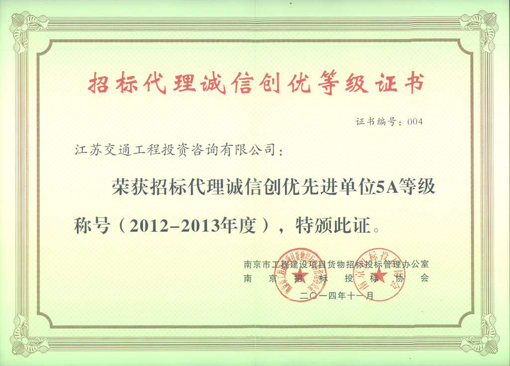 近日,我公司榮獲2012-2013年度南京市招標(biāo)代理誠信創(chuàng)優(yōu)先進(jìn)單位5A等級稱號。