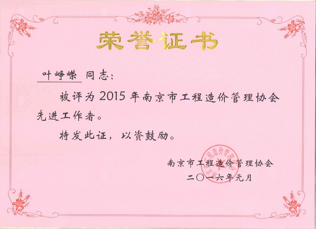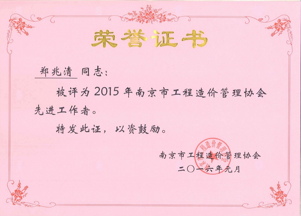 公司副總工程師葉崢嶸、鄭兆清榮獲2015年南京市工程造價管理協(xié)會先進工作者。