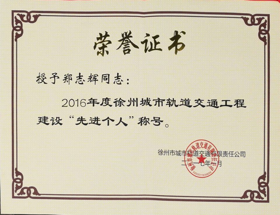 二O一七年一月,我公司榮獲徐州市城市軌道交通有限責(zé)任公司頒發(fā)的“2016年度徐州城市軌道交通工程建設(shè)先進(jìn)集體獎(jiǎng)”;同時(shí),我公司員工鄭志輝獲得“2016年度徐州城市軌道交通工程建設(shè)先進(jìn)個(gè)人稱號(hào)”。